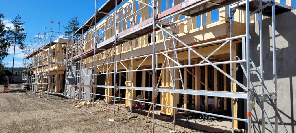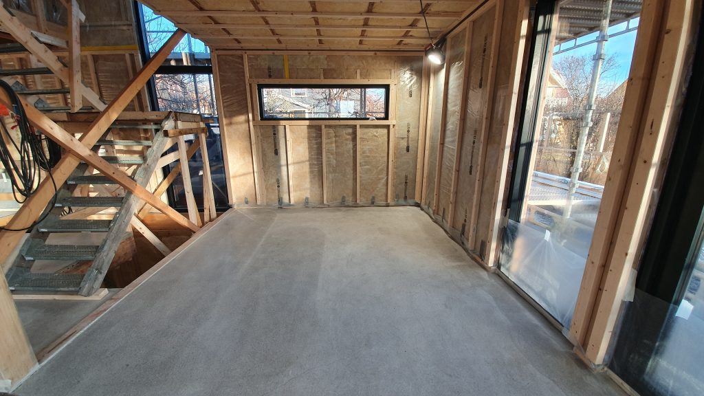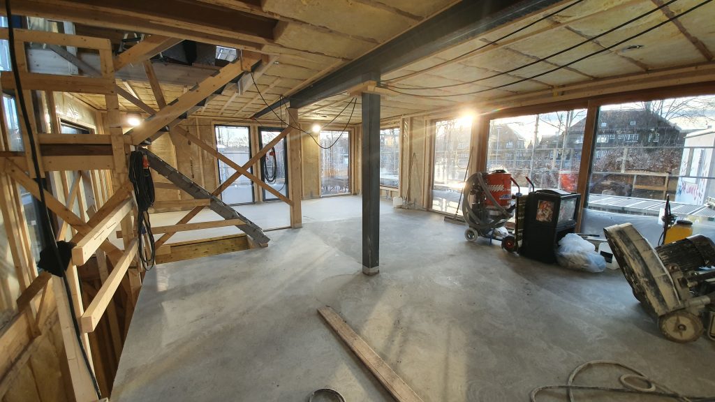 Etasjeskillet mellom leilighetene i 1 og 2 etasje har flytende svalehaledekke på bjelkelag og trinnlydstrimler, og dermed også dekket trinnlyddemping mellom enheter med hele 5dB bedre enn kravet.